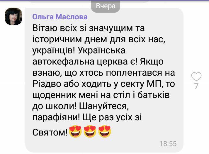 Педагог назвала «сектой» каноническую церковь на своей странице в Facebook . Также учительница математики общеобразовательной школы № 15 города Винницы Ольга Маслова намерена писать замечания в дневник и вызывать в школу родителей тех детей, которые будут ходить в храмы Украинской православной церкви МП.