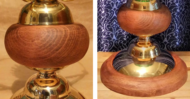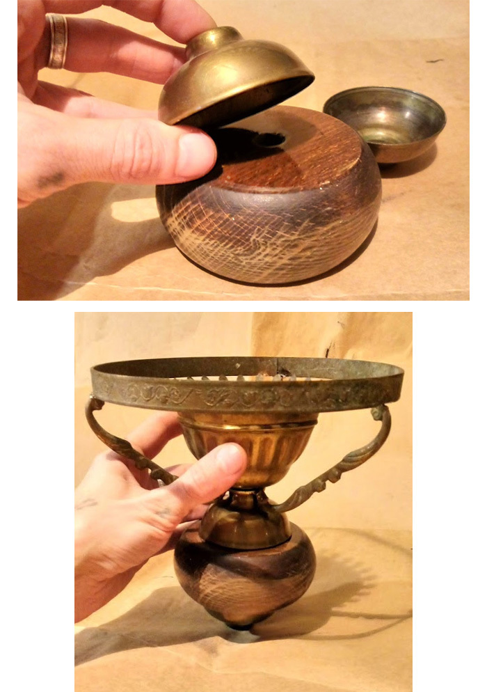 Снова покопавшись в гараже, нашел ещё кое-что, из чего можно собрать стойку лампы. Это два небольших латунных колпака (похоже, от этой же лампы), и старая деревянная кубышка - её можно использовать вместо фарфорового основания стойки. Если всё вместе сложить, то получится вот что: