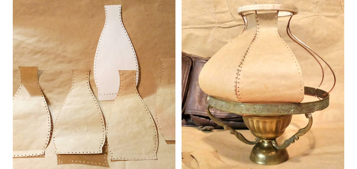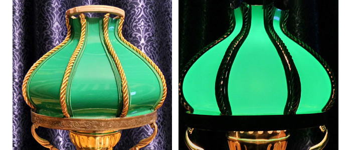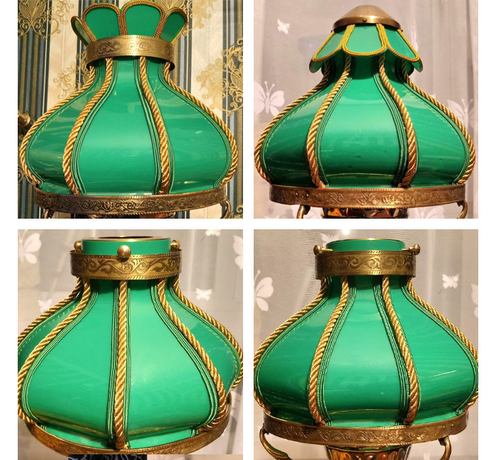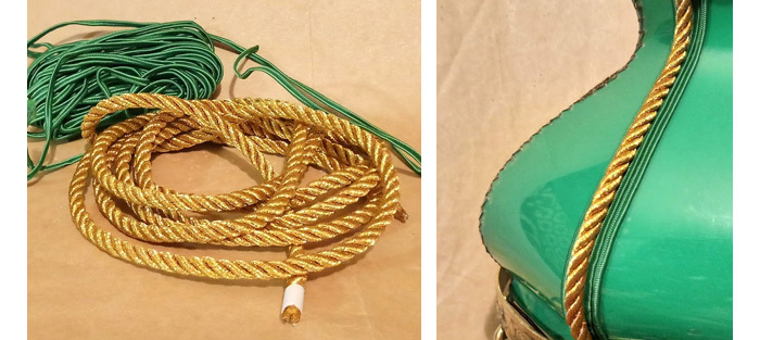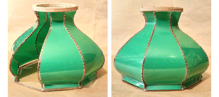 Зелёный сутаж как раз под цвет абажура, наклеил его по краям стыка, чтобы он скрывал отверстия и не давал пробиваться свету от лампочки изнутри. Витой золотистый шнур приделал поверх самого шва, чтобы он образовал ребро между гранями. В целом, на мой взгляд, такая отделка должна нормально сочетаться с дизайном этого светильника, и я приступил к отделке всех остальных швов. Наконец, отделка завершена и мне уже не терпится испытать абажур с включенной лампочкой.