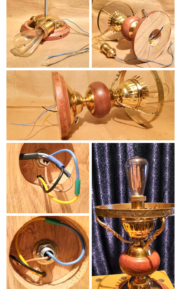 За то время, пока занимался абажуром, раздобыл для лампы круглую деревянную подставку и ещё кое-какие латунные детали. Всю латунь отполировал до блеска, деревянные изделия зачистил от старого лака и отшлифовал. Теперь у меня практически полный комплект, и самое время произвести тестовую сборку всей конструкции.