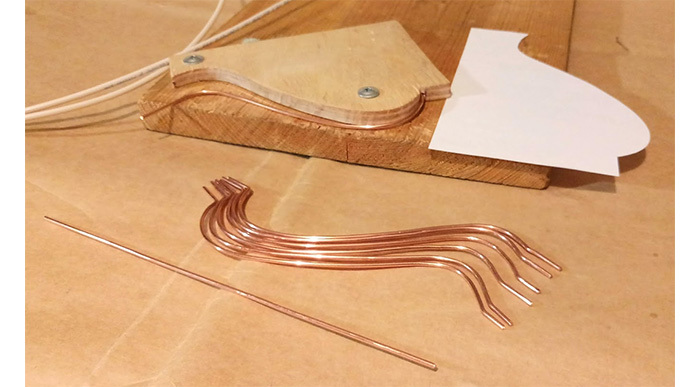 Нарезаем из проволоки 8 прутков нужной длины и каждый из них сгибаем по шаблону. Чтобы гнуть было легче и при этом получать одинаковую форму изгиба, выпилил из толстой фанеры специальный шаблон и закрепил его к доске.