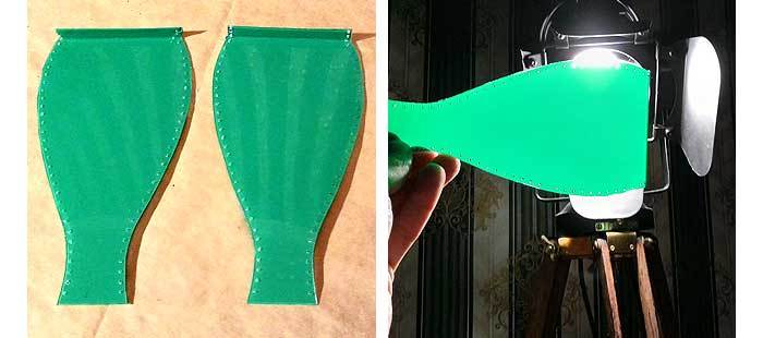 На фото справа видно, что свет изнутри всё же пробивается через щели. Дело в том, что края пленки на 4-5 мм не доходят до краев пластин, т.к. уже после сшивки я подрезал пленку об самые отверстия. Это пришлось сделать потому, что пленка начала пузыриться и отслаиваться на изгибах, а т.к. ее края были прошиты - воздух нельзя было выгнать. Пришлось подрезать края пленки. В результате, чтобы закрыть пробивающийся свет, отделка швов стала такой широкой (почти 15 мм). Чтобы никакие щели больше уже не просвечивались, дополнительно проклеил швы изнутри полосками зеленой пленки. Справа на фото - результат на просвет при включенной лампе.