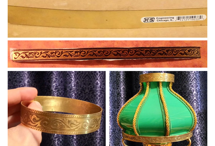 Моя следующая задача - отделка верхнего кольца абажура. Нашел у себя латунную полоску подходящего размера, нарисовал на ней черным маркером орнамент в том же стиле, что и на большом посадочном кольце. Затем с помощью раствора хлорного железа вытравил на полоске орнамент. Сгибаем её по окружности нужного диаметра и пробуем надеть на фанерное кольцо.