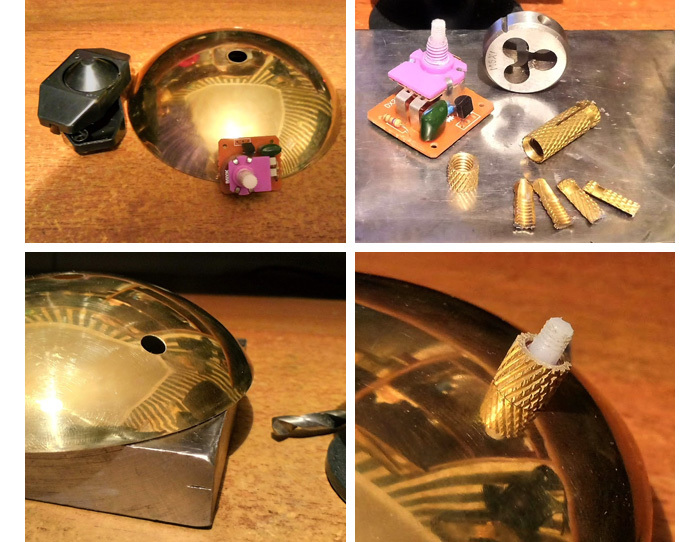 Сначала подготовим сам димер. Вынимаем его из заводского корпуса, примеряем - по габаритам проходит. На нём резьба М7 с мелким шагом, но крепежная гайка в комплекте не предусмотрена. Это плохо, т.к. и у меня не нашлось подходящей. Пришлось на димере перерезать резьбу под М6, а вместо гайки отпилил часть от латунного анкера. Затем просверливаем колпак в нужном месте и крепим димер.