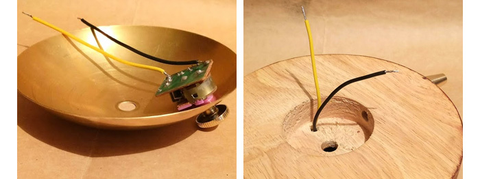 Ну и, наконец, производим сборку конструкции с электропроводкой. Сначала припаяем два небольших проводка к димеру - на вход и на выход, и выводим их через отверстие к днищу деревянной подставки.