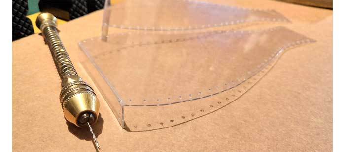 В общем, бумажное тестирование показало, что всё получается, как было задумано, и можно переходить к резке ПЭТ. Имеющиеся куски этого пластика толщиной 1 мм довольно упруги. Простыми ножницами, хоть и туго, но режутся. А вот отверстия для сшивки, как оказалось, лучше всего просверливать, а не пробивать и не прожигать. Но блин, это ж сколько мне придётся сверлить! Дай бог терпения ))...