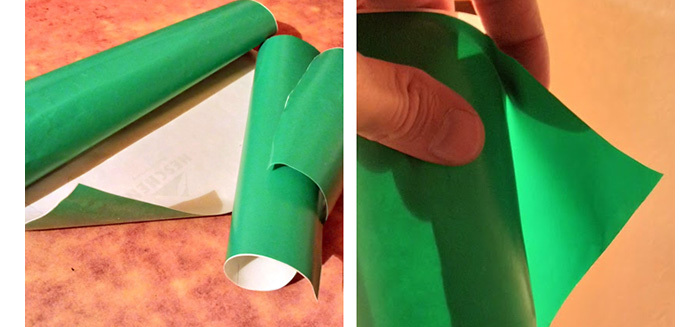 Итак, рекламное агентство любезно предоставило мне несколько кусков прозрачного ПЭТ, и впридачу ещё обрезки зелёной самоклеящейся плёнки. Она бывает как непрозрачная, так и светопропускающая (транслюцентная, для изготовления световых вывесок). Вот она-то мне и досталась.