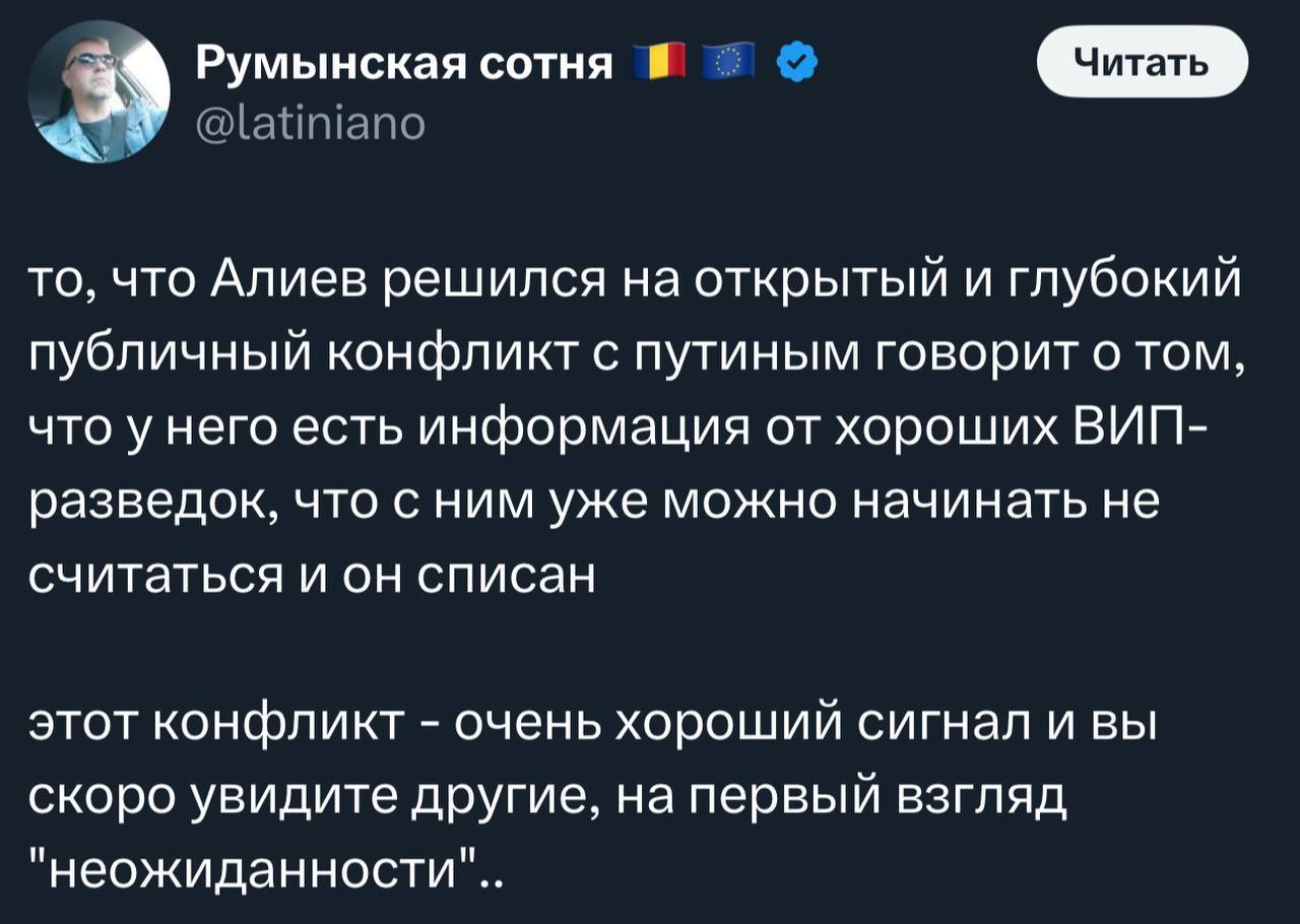 70 BorschRusso ВИП-разведка сообщает - из дурдома раздался стук!1 4 месяца назад Fake News X (Twitter) Скриншот Юмор Политика Россия Азербайджан Дичь Бред Владимир Путин Ильхам Алиев 14 7 1 Ещё 0