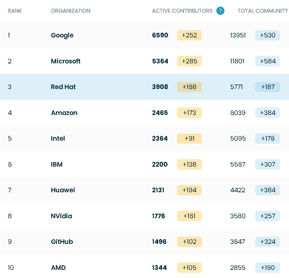 3 - Red Hat, 3908 Active contributors (без IBM)