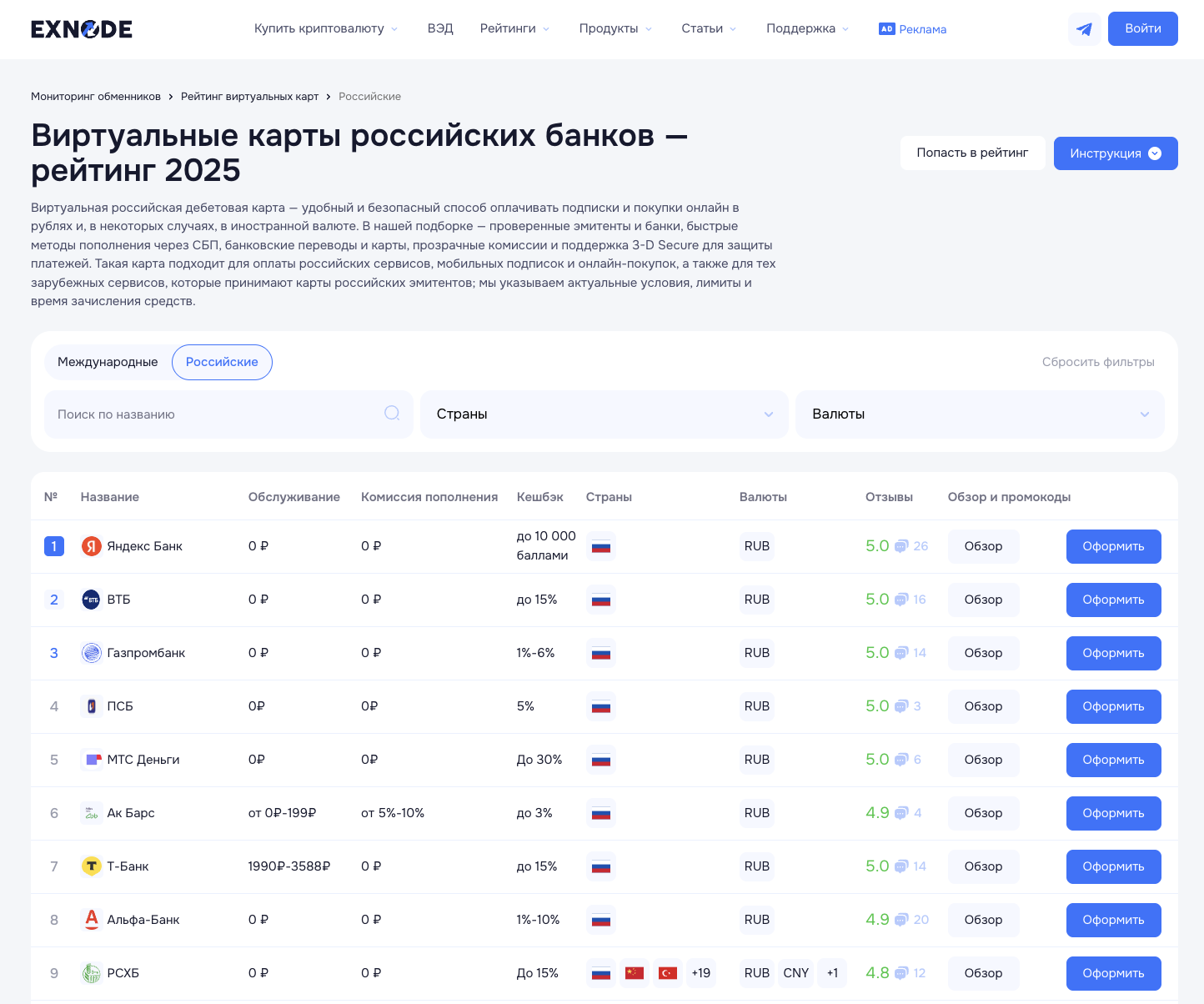 Сначала определитесь, где вы хотите оформить карту. Чтобы не тратить время на самостоятельное изучение разных сайтов, пользователи обращаются к сайтам-мониторингам, таким как Exnode, которые собирают отзывы пользователей и условия разных сервисов.