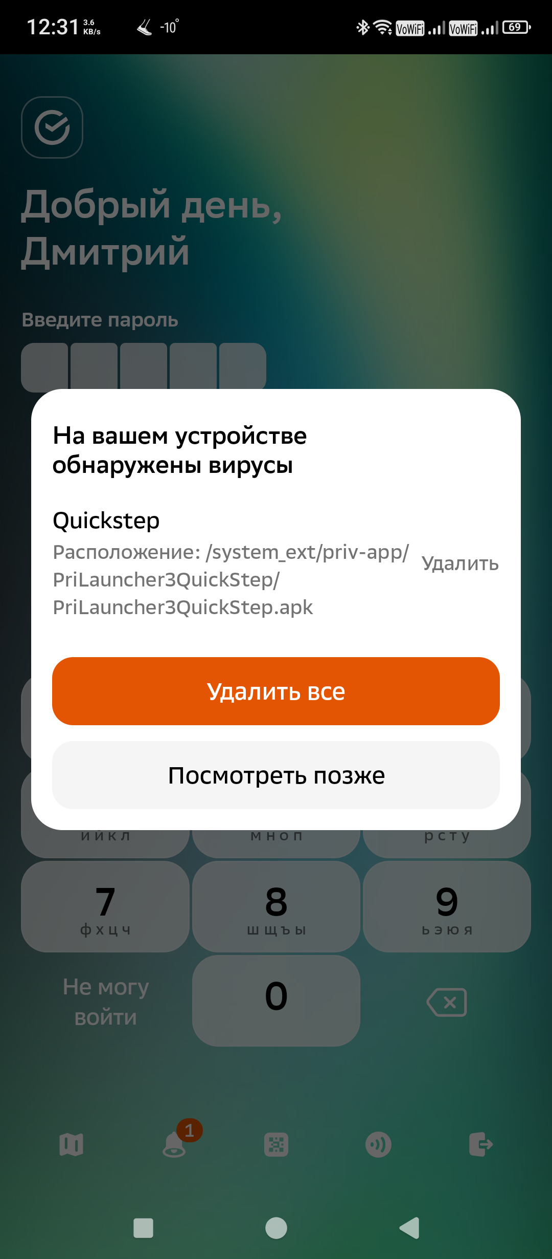 Сбербанк выдаёт уведомление, что у меня на телефоне вирус. Вот такой. Причём при нажатии на "удалить" ничего не происходит.