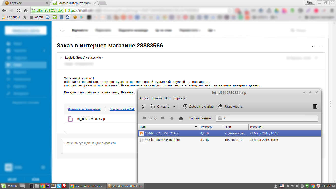 Дождался. Наконец-то я получил вирус, который шифрует файлы на компьютере. В этот раз рассылка была от имени интернет магазина, внутри архив, внутри архива - javascript-файл.