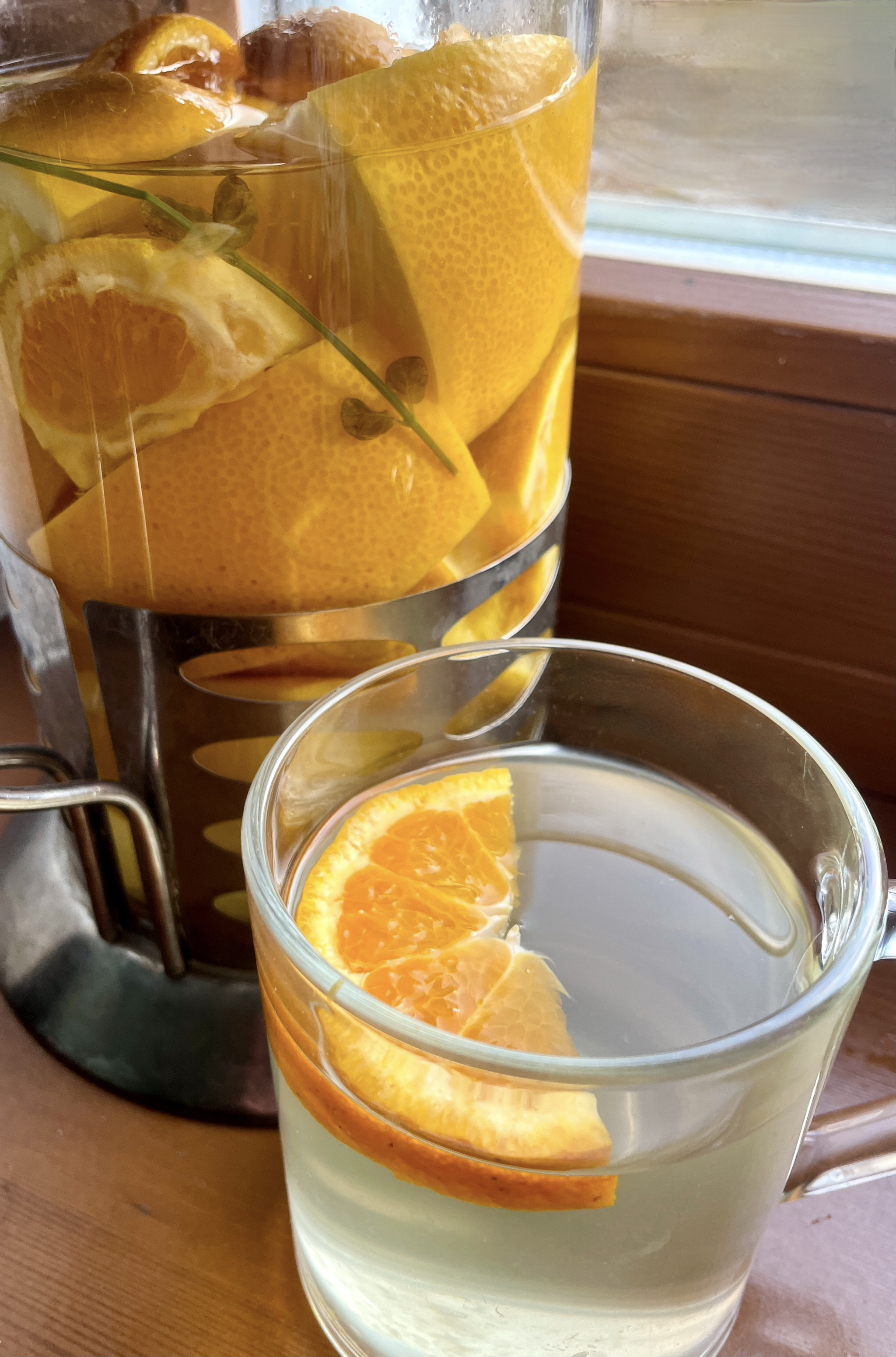 Вот так, например. Покрошил один грейпфрут, пару мандаринов и веточку мяты отщипнул. Мята, не смотрите, что такая невзрачная, вс-таки декабрь на дворе. А она на улице растет, хоть и в горшке.