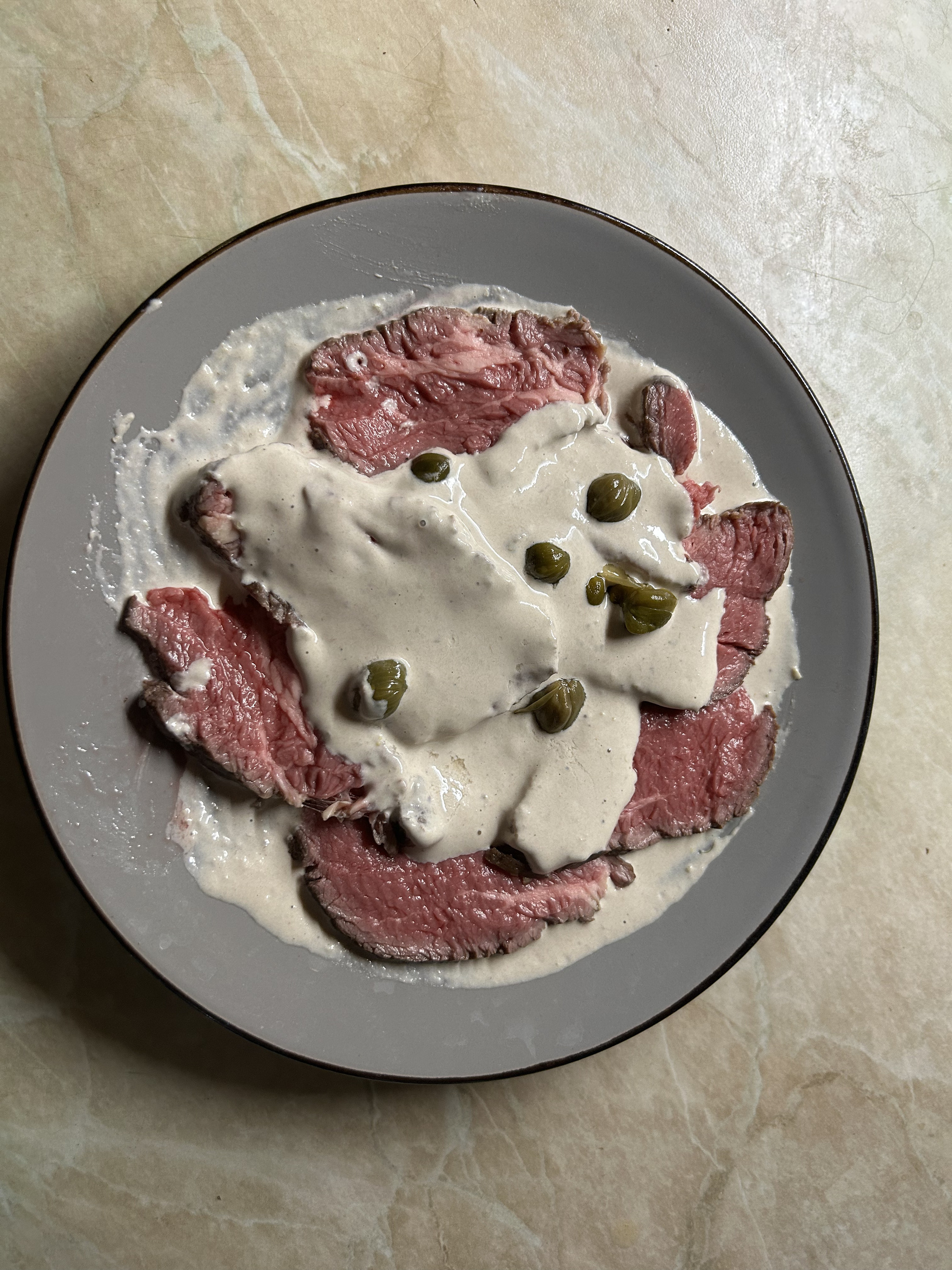 Для начала немного базы: вителло-тоннато, это классическая итальянская закуска, представляющая из себя: нарезанный ростбиф и соус из тунца, он по факту так и переводится: "ростбиф и тунец", т.к. оба эти части можно использовать раздельно друг от друга я разделю и рецепт, ну что же погнали!