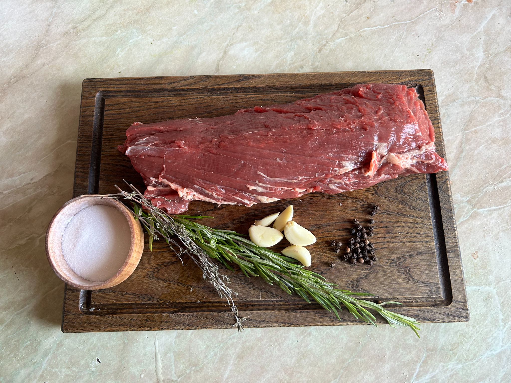 Телячья вырезка - ~600гр: в этот раз у меня был не самый толстый кусок, из которого я вырезал самую серьезную его часть. Мраморность, нам в этом рецепте не важна, но в моем куске присутствовала.
