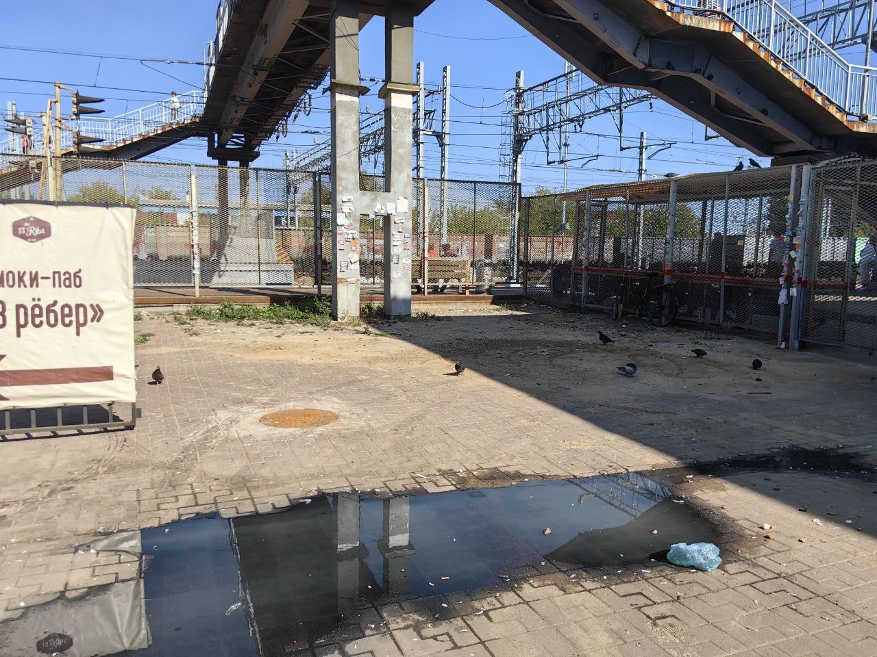 На протяжении полугода домодедовцы и все, кто приезжает в город, вынуждены наблюдать грязь, которая растаскивается по привокзальной площади, и вдыхать запахи канализации, которая разливается время от времени. Валявшиеся трупики голубей уже истлели.