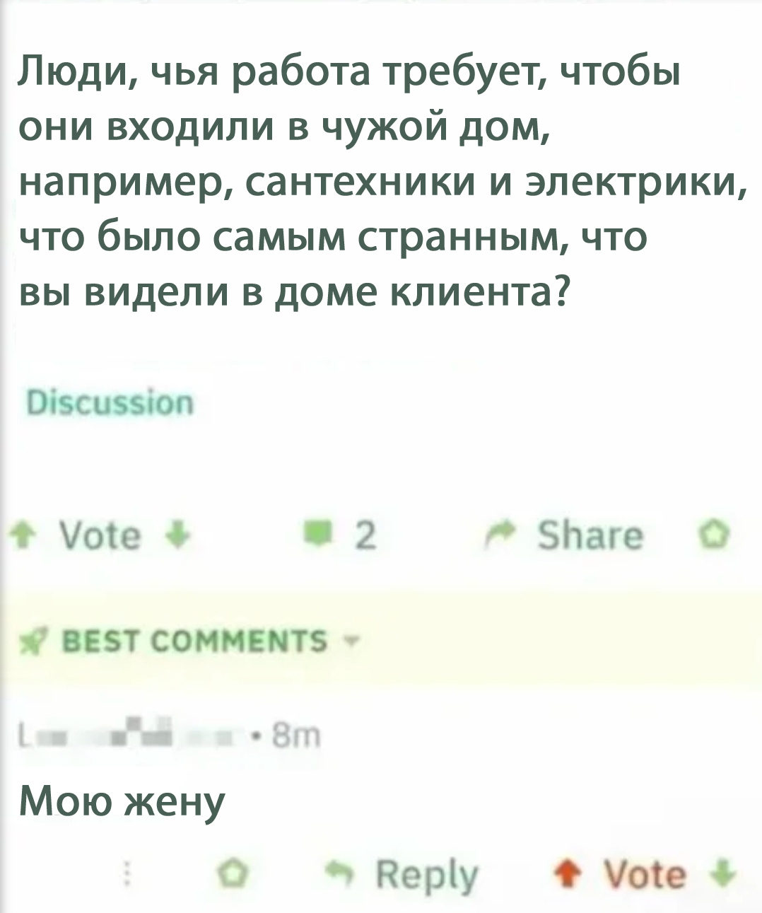 1503 purrxel Юмор для всех и каждого Визиты на дом1 3 месяца назад Telegram (ссылка) Жена Сантехник Электрик Юмор Скриншот Reddit Telegram (ссылка) 114 15 1 Ещё 0