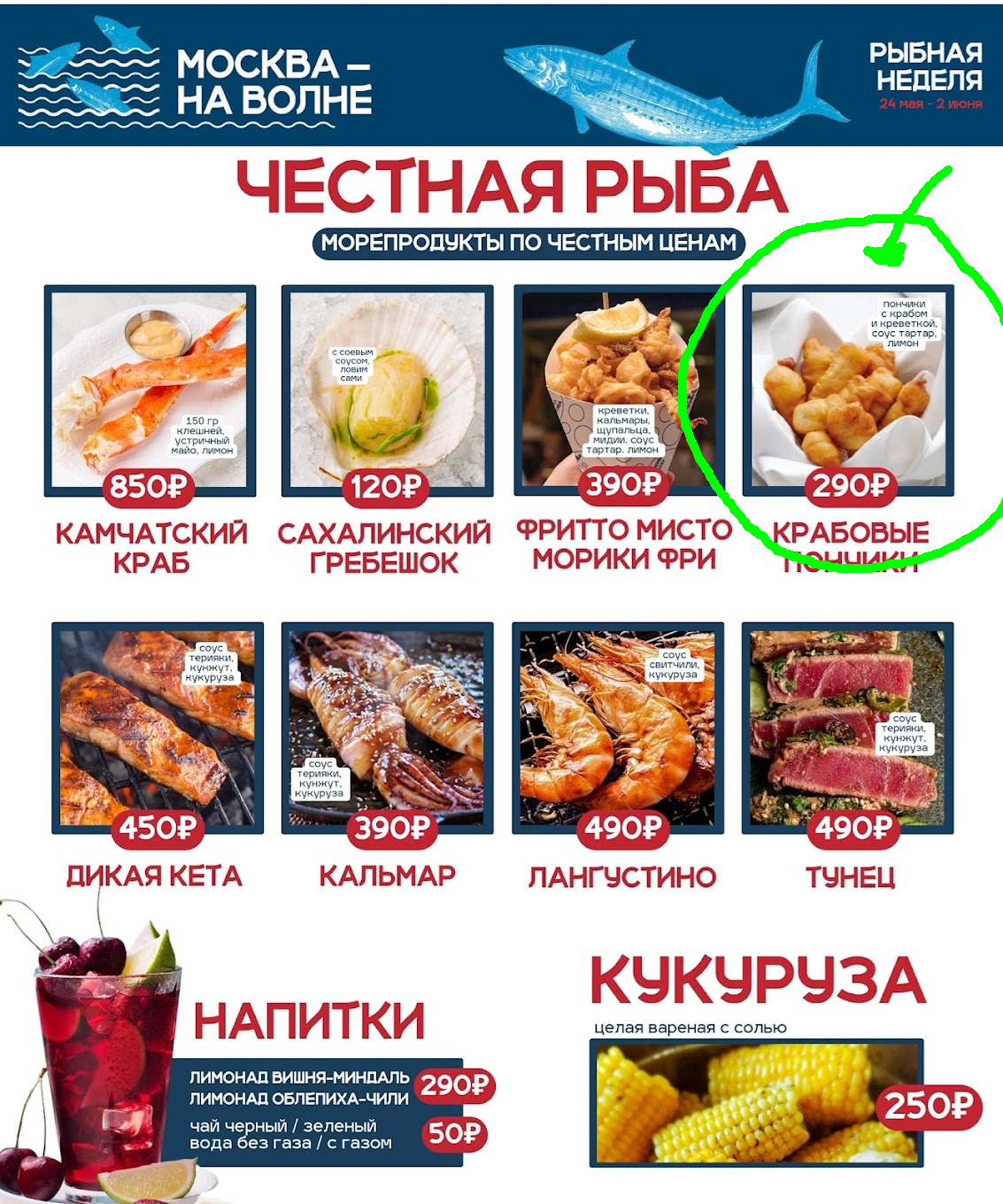В Москве проходил рыбный фестиваль. На картинке в меню гигантский кулек с горой пончиков.