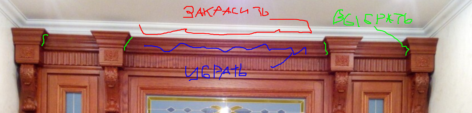P.S. а ведь можно было сделать это технически, несмотря на то, что обусловлено натяжным потолком -- плинтус потолка окрасить в этот же цвет, на ровных элементах входной группы плинтус убрать, а на колоннах сзади выбрать дерево так, чтобы оно аккуратно обходило плинтус.