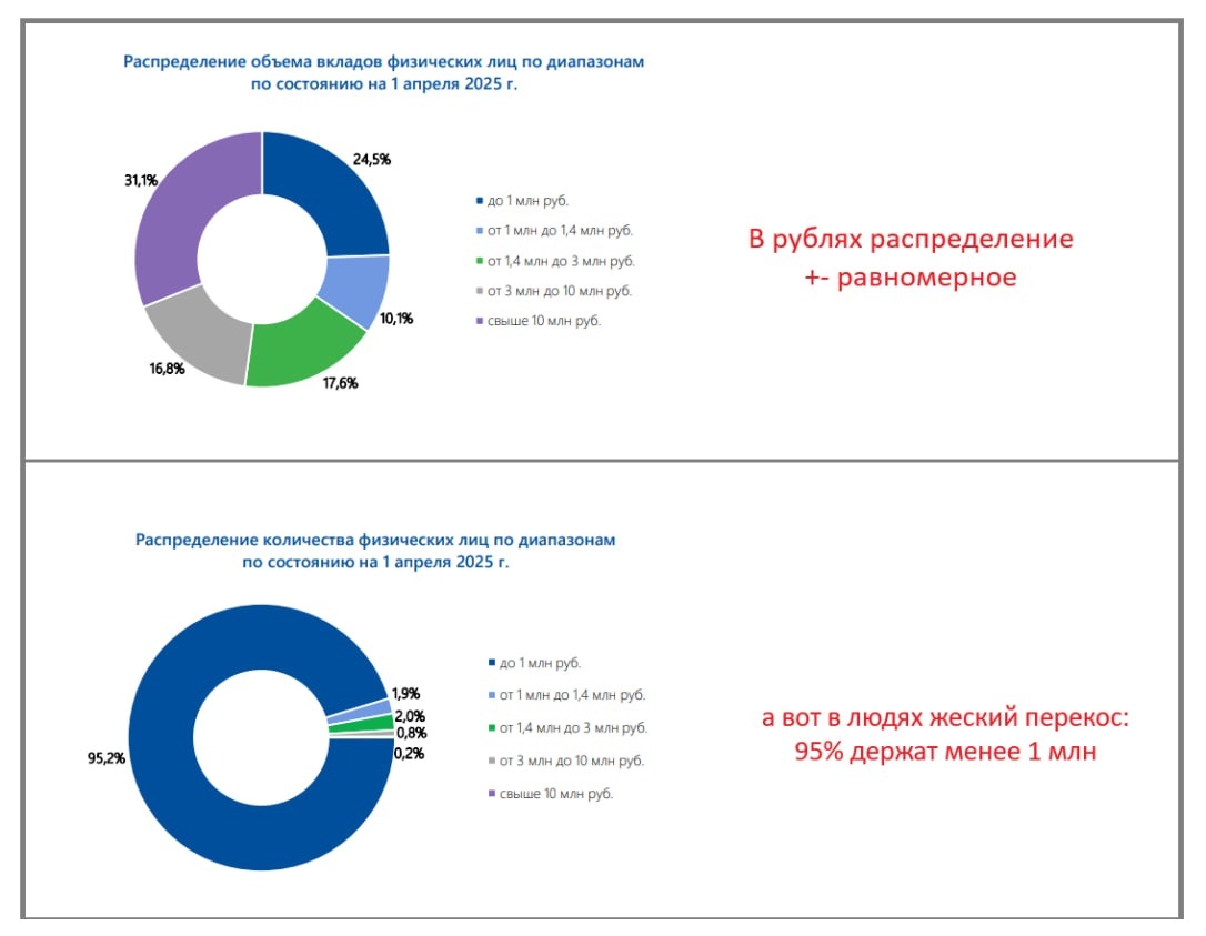 • а вот в количестве вкладчиков жеский дисбаланс — 95% держат меньше 1 миллиона. Если сузить и взять сумму от 3 млн и до бесконечности, то их всего 1% от общего числа, но на них приходится половина всех вкладов.