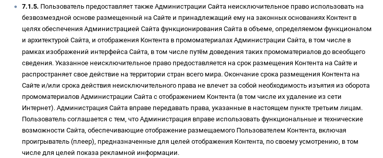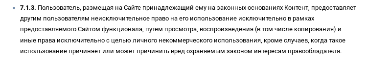 При этом п. 7.1.7 устанавливает, что пользователи не должны загружать на сайт контент, исключительные права на которые принадлежат другим лицам и в отношении которого они не имеют соответствующего разрешения на подобное использование.