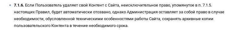 В п. 7.1.6 указано, что пользователь может «отозвать» предоставленные права в отношении ранее загруженного контента посредством его удаления: