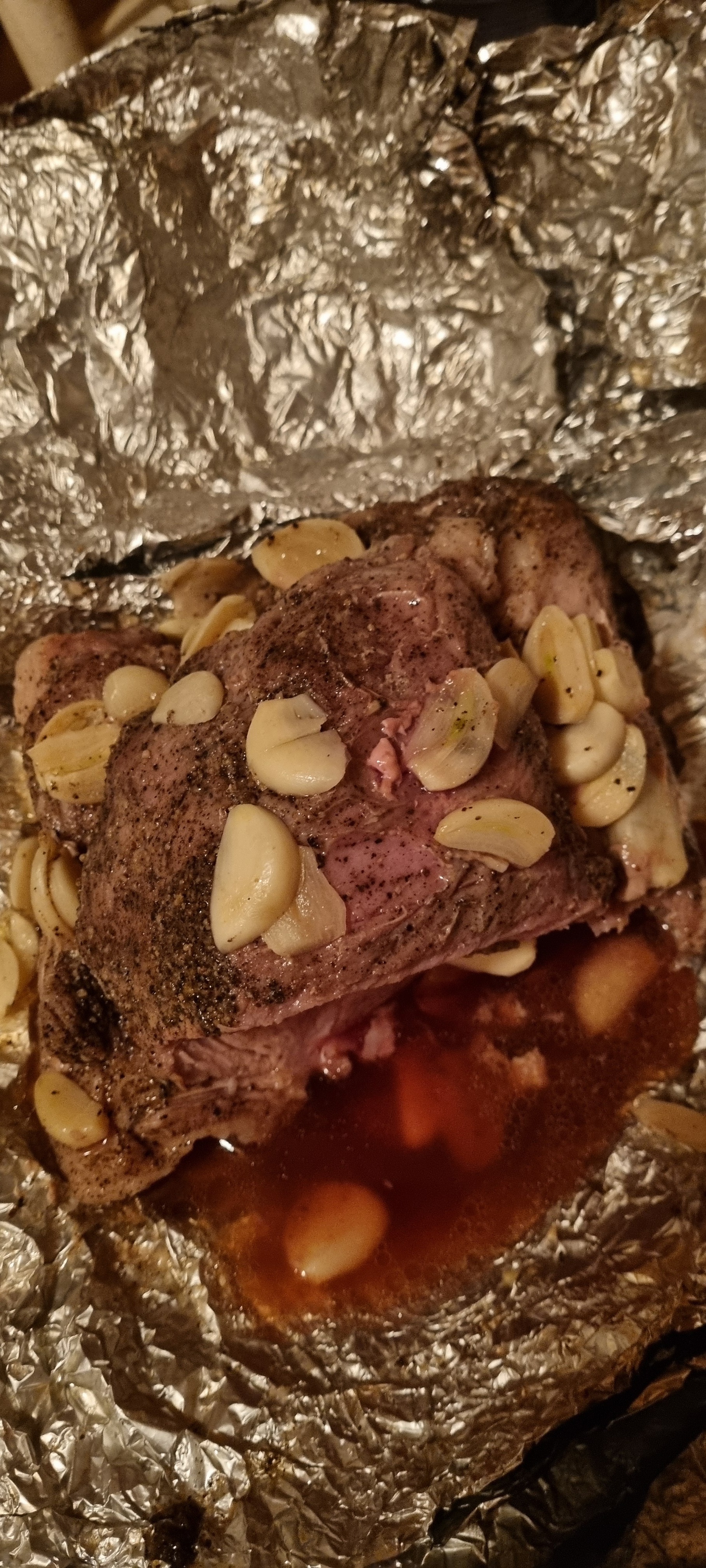 Взял шейки 1.5 кг, обтёр маслецом оливковым, натёр перчиком чёрным и солью, дал настояться, выложил на чесночёк на фольге, внутрь его напихал и сверху обсыпал. Запеленал и в чашу мультиварки на режим "выпечка" на 45 минут.