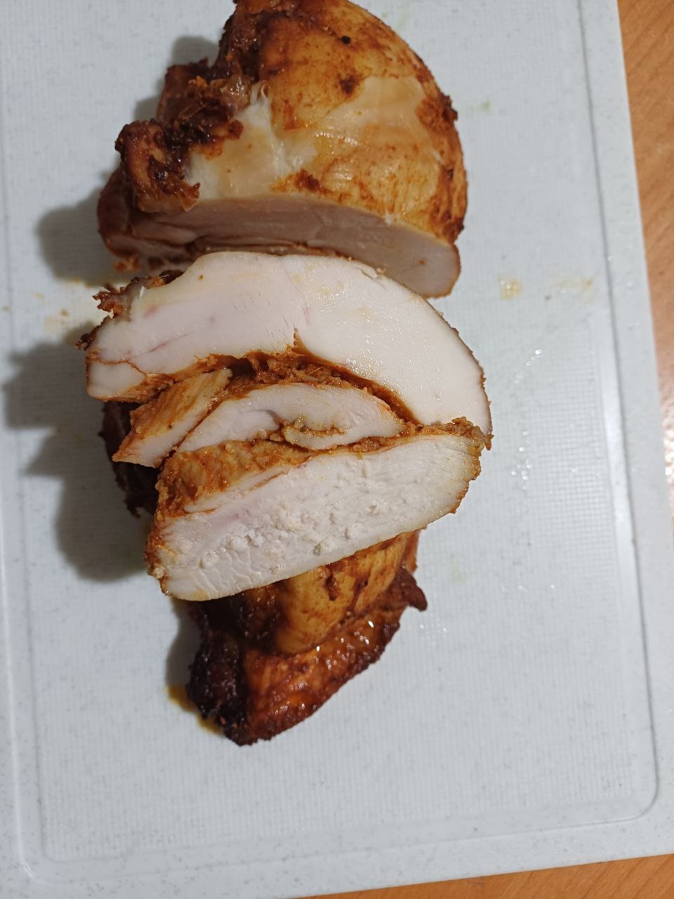 Перед запеканием переворачиваю грудку, чтобы та сторона, что была сверху, немного побыла в маринаде. Разогреваю духовку минут 5-7. И готовлю 30 минут на 250 градусах. После таймера, выключаю духовку и оставляю пастрому внутри духовки.