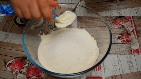 1. В миску просеиваем муку 3 стакана, высыпаем 100 грам сахара, добавляем 2 столовые ложки сметаны.