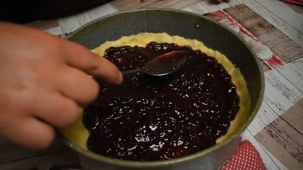 7. Кладем начинку, я использую малиновое варенье, равномерно разравниваем.