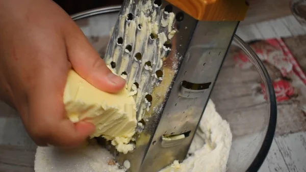 8. Натираем другой кусочек теста на крупной терке.