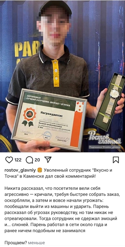 «🤮 Сегодня в 3 часа ночи ехал из Ростова в Москву. По дороге заехал во «Вкусно — и точка» в Каменске. Сотрудник грубо начал разговаривать, я заподозрил, что что-то не то, пошел смотреть, как он готовил, и увидел, что в каждый заказ плюет! - пишет подписчик "Ростов Главный"»