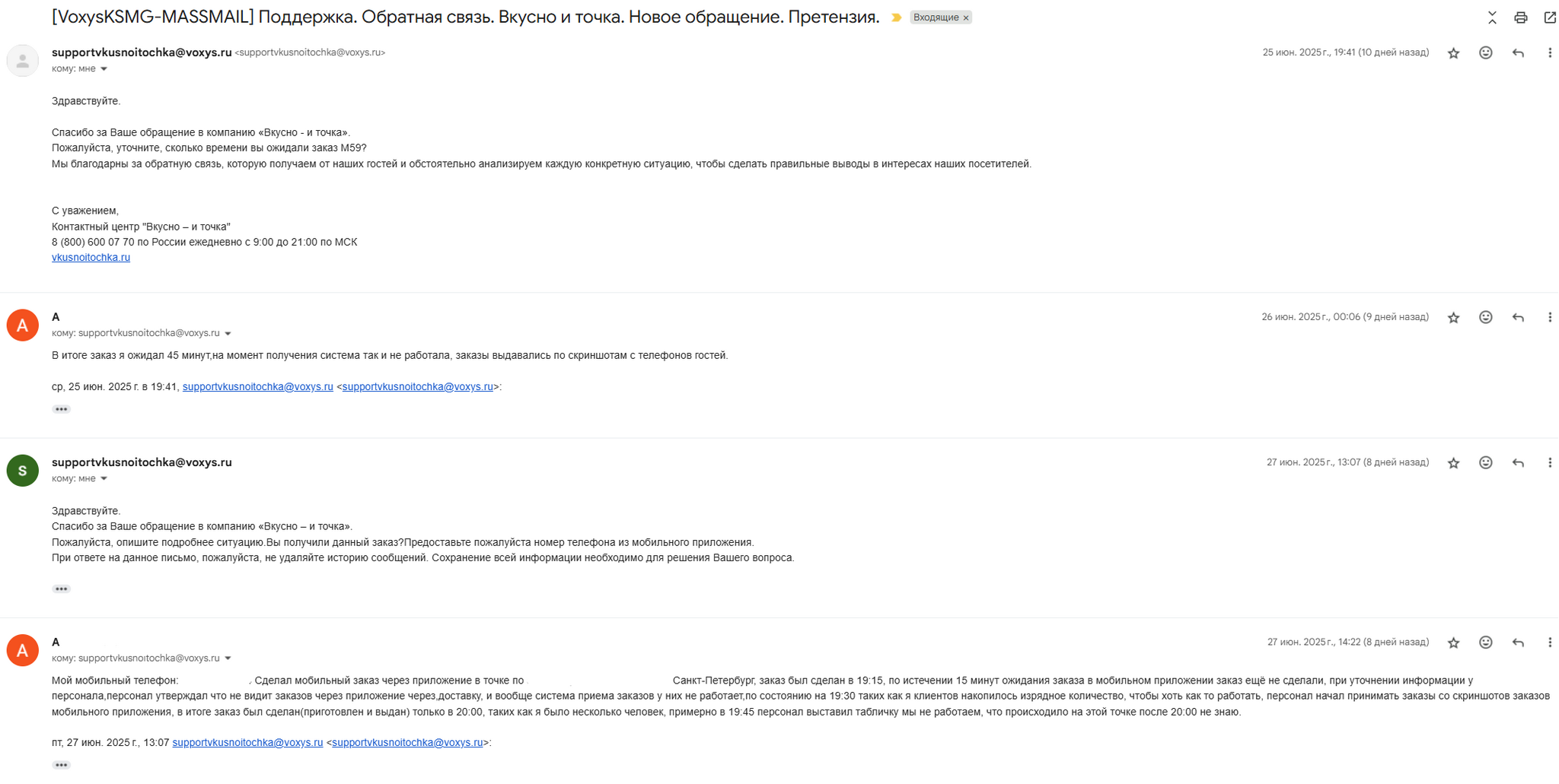 Всегда нормально относился к этой сети, как минимум как к достойной альтернативе шаверме или прочей еды такого класса, которой можно перекусить где-то недалеко от объекта, вкус давно приелся, но качество норм и хотя бы можно быть уверенным в том, что после посещения такого заведения не придется бежать в туалет. Но собственно о чем я, пока это был макдак они очень оперативно реагировали на каки-либо косяки со своей стороны, если задерживали заказ, извинялись давали какие-то бонусы к нему и.т.д. А сейчас столкнулся с тем, что им просто на все насрать, не нравится что-то ну и не ходите. А теперь к сути: был пару недель назад в 1 точке этой сетки в СПб(точка проблемная как оказалось, по отзывам в яндекс картах) сделал там с товарищем заказ на вынос и... прождал заказ 1час и таких как я было еще человек 20, просто коллапс, у них там сломалась система или еще что, но мобильные заказы продолжали принимать, персонал не знал что делать, а главное не видел заказов и не мог их готовить, кое как по скринам заказов с телефонов они начали выдавать заказы. На тот момент, когда мы все же получили свой заказ в зале оставалось еще человек 10 таких же бедолаг и подходили новые. Понятное дело что в эту нору фекаллоида мы больше не пойдем, но суть поста не в этом, суть поста в реакции службы поддержки, которая получила жалобу на работу своей точки день в день, обещала дать обратную связь в течение 48 часов а в итоге просто пересылает 2 недели 1 и тоже письмо с отпиской и до сих пор нет никакого ответа.