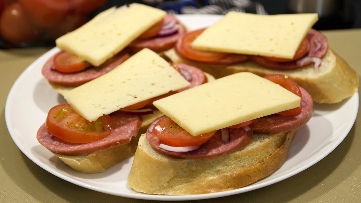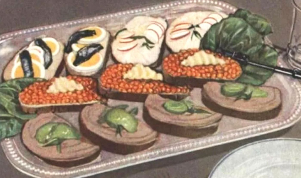 Они привлекали простотой и хорошим обзором компонентов, которые уложены сверху, что вызывало аппетит. Представляли собой тонкий ломтик хлеба, на котором лежала колбаса, ветчина или бекон.