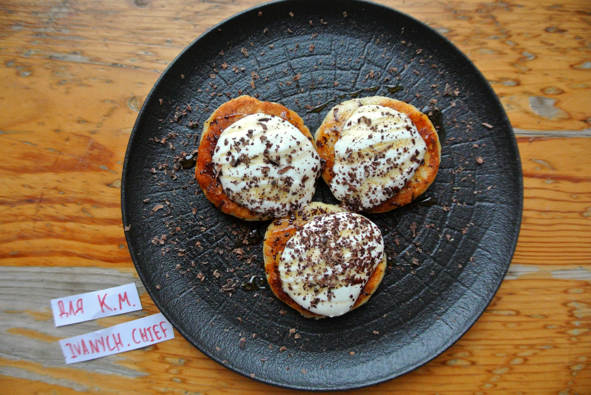 Раскладываем по тарелкам, добавляем сметану, сверху поливаем жидким мёдом и посыпаем тёртым шоколадом.