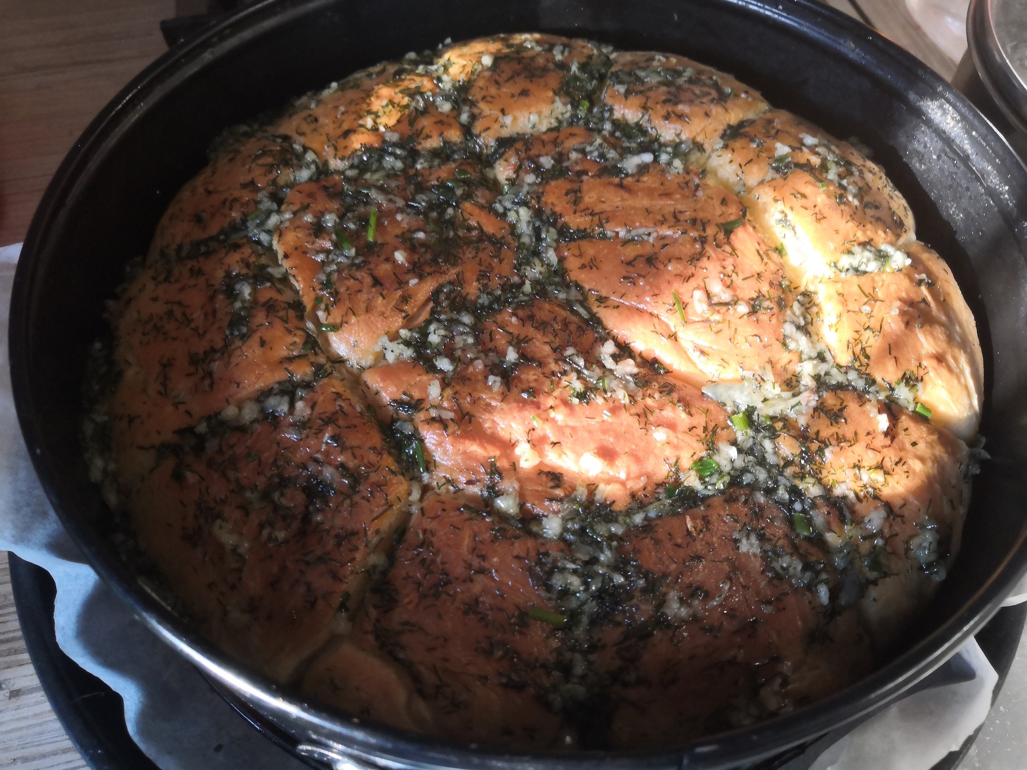 Снимаем пленку. На дно духовки ставим кастрюлю с водой и выпекаем пампушки до готовности при температуре 170 градусов примерно 30-35 минут.