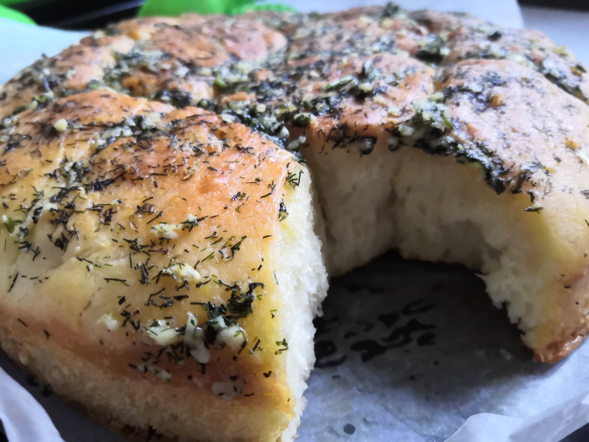 Когда мы поставили тесто подниматься, сразу делаем чесночное масло. Для этого мелко нарезаем чеснок, соединяем его с растительным маслом, укропом и я добавила еще розмарин. Это если вы любите, когда чесночек чувствуется и похрустывает.