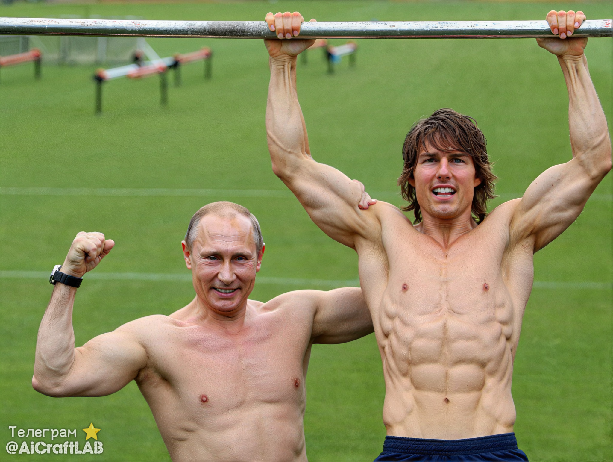 Tom Cruise and Vladimir Putin in full growth with bare, toned torsos like bodybuilders, Tom Cruise pulls himself up with effort on a horizontal bar in the style of Street Workout on a sports field, and Vladimir Putin stands next to him and smiles, showing his biceps.