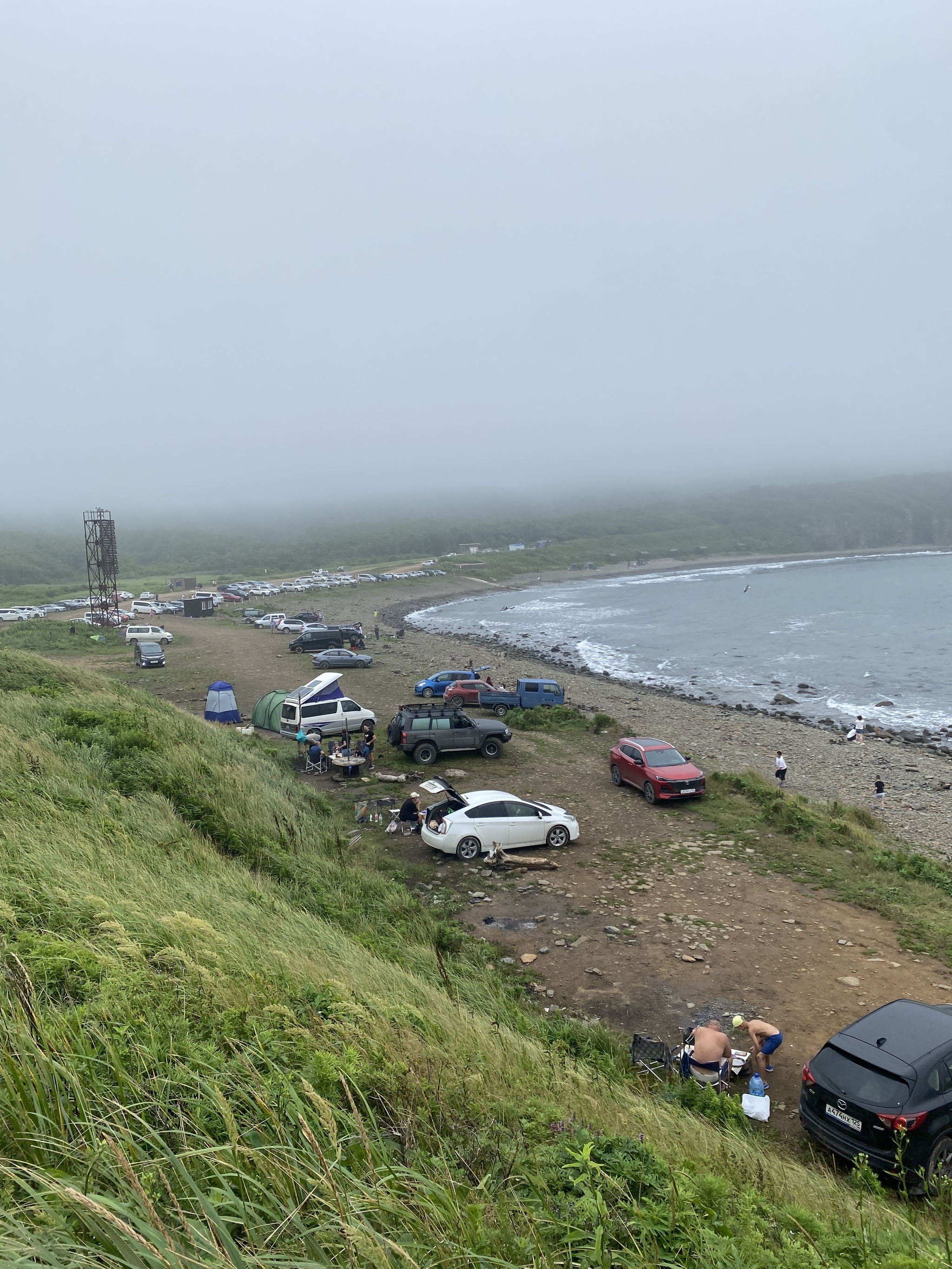 Приехали к пляжу… и только посмотрите сколько людей и машин, а какой вид… Люди приезжают с палатками на выходные, множество туристов готовых дойти до «края русской земли».