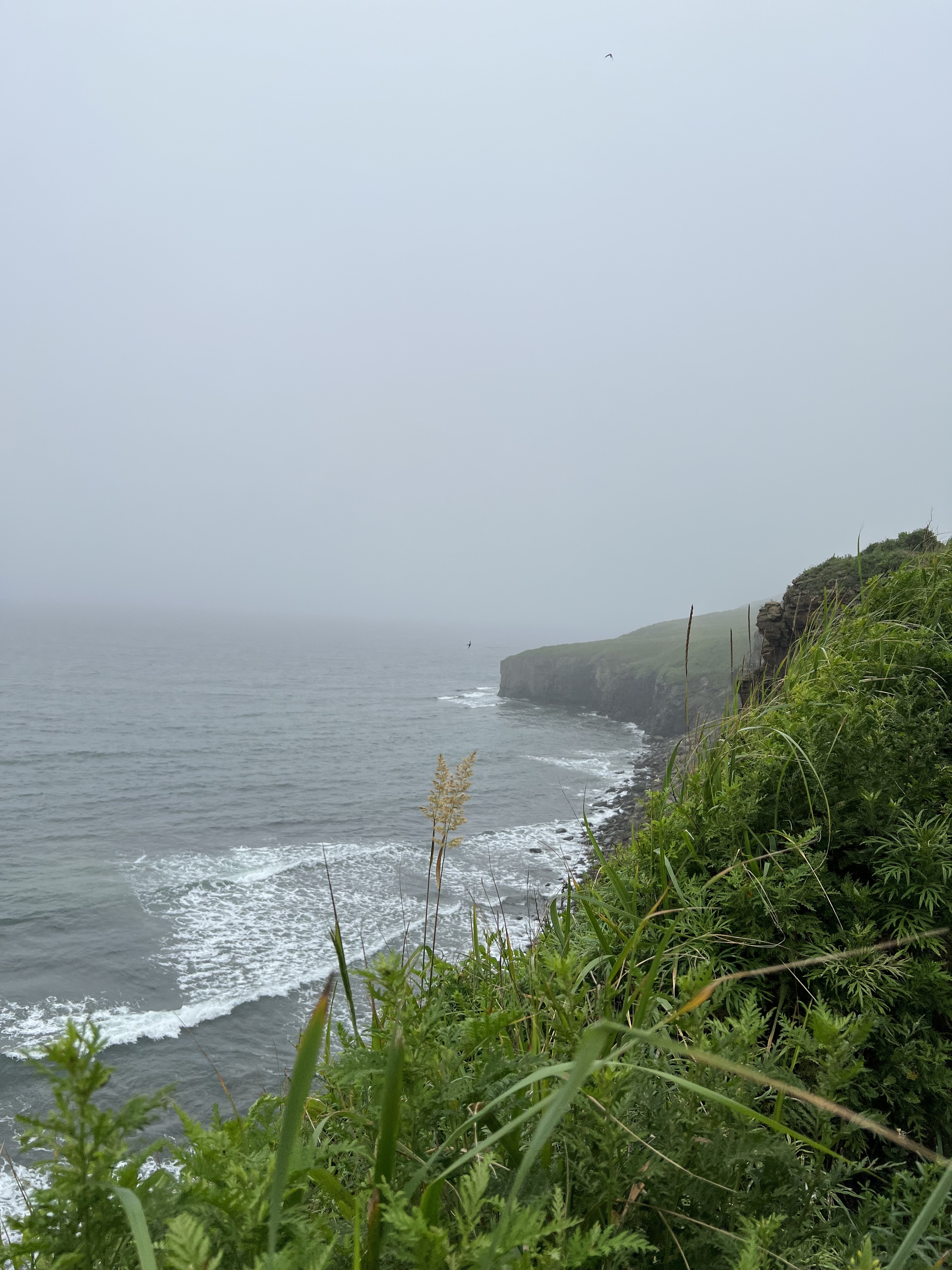 Идти 3 км - 40 минут в одну сторону, по хребту над обрывом. Рядом шумит океан. Летают чайки.