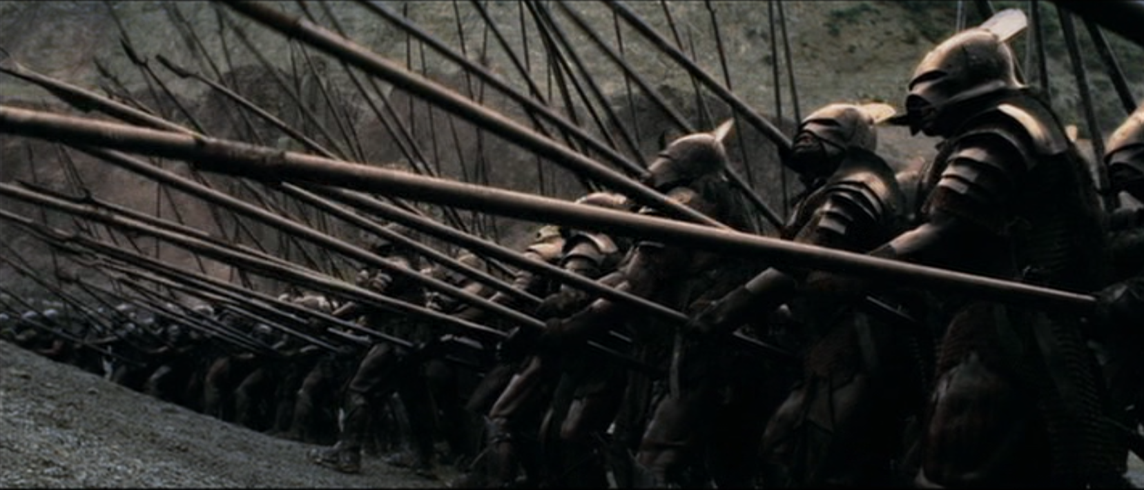 Фактически перед нами некая вариация испанской терции, только значительно лучше защищенная. В рамках того, что нам показывают в фильме концепция правильная - мудрый Саруман вырастил и вымуштрововал 10 000 отличных бойцов, вооружил их и снарядил для борьбы с конницей и штурма крепостей, после чего снабдил взрывчаткой и мощнейшими аркбаллистами. В рамках сценария выходит лажа, потому что такая армия должна была вынести Рохан в одну калитку и никакие эльфы тут бы не помогли. Слишком большая разница в классе вооружения и численности. В следующем посте надо уже по идее разобрать именно битву за Хельмову Падь, там все это защитное и наступательное снаряжение сыграет в динамике и сразу многое будет ясно.