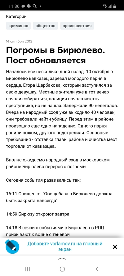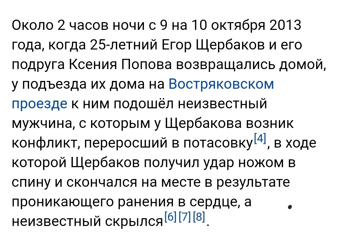 В октябре 2013 года поздно вечером молодая пара возвращалась домой, к девушке стал приставать человек кавказской наружности. Парень, естественно, заступился за подругу, за что получил удар ножом в спину. От чего умер.