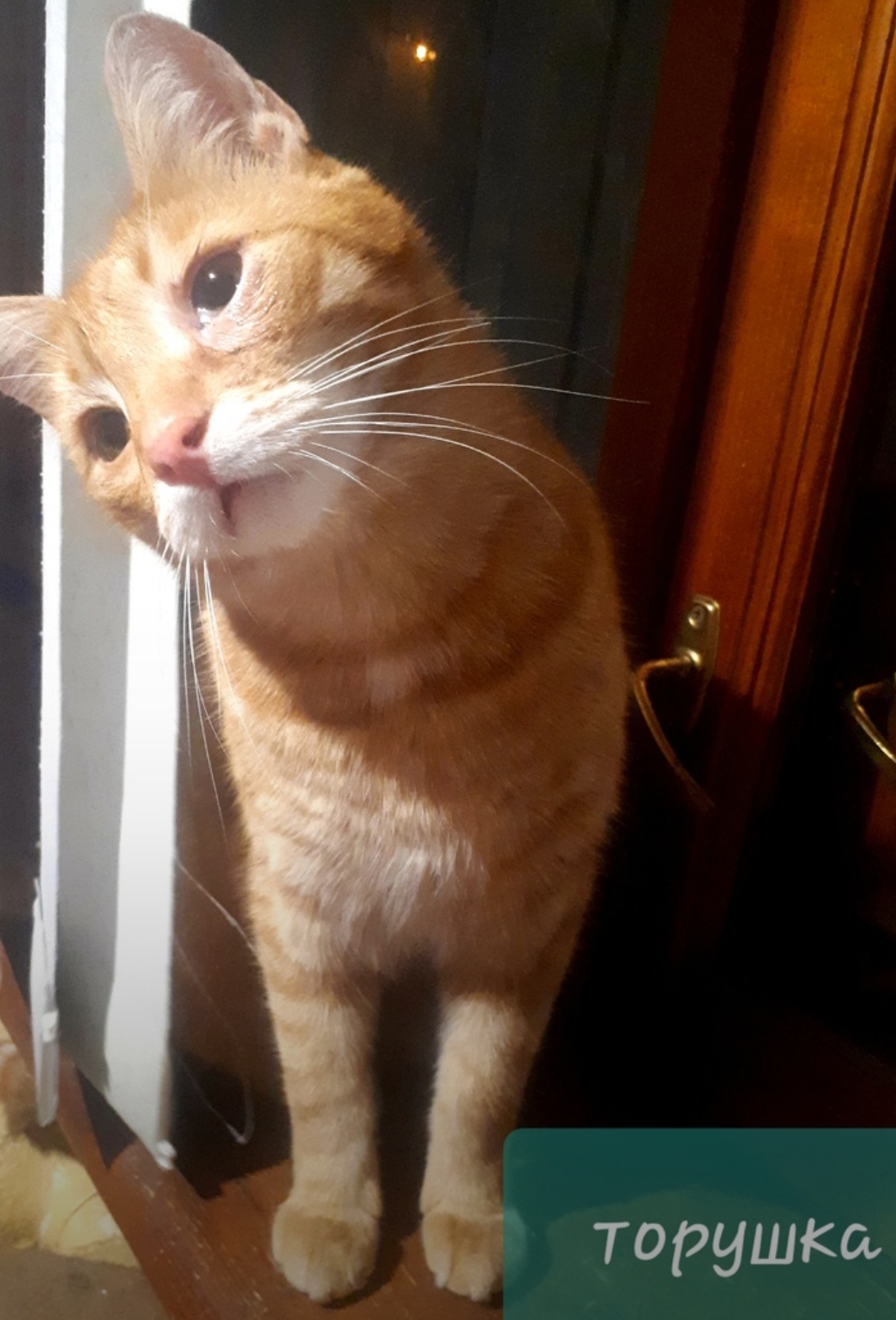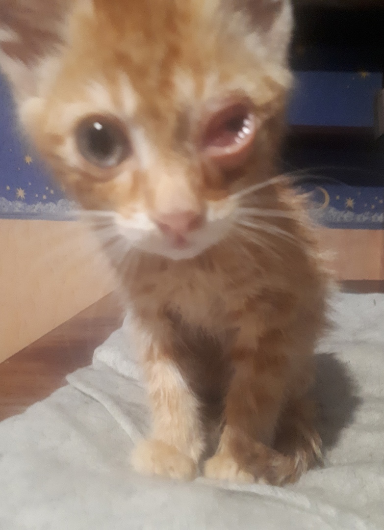 сейчас это роскошный рыжий красавец кот!!!! Торушка гроза окрестных котов . нрав имеет веселый бесшабашный . Озорной очень смелый и задиристый.). глаз пролечили, видит но инфекция оставила небольшой след-слезные протоки повреждены постоянно слезится
