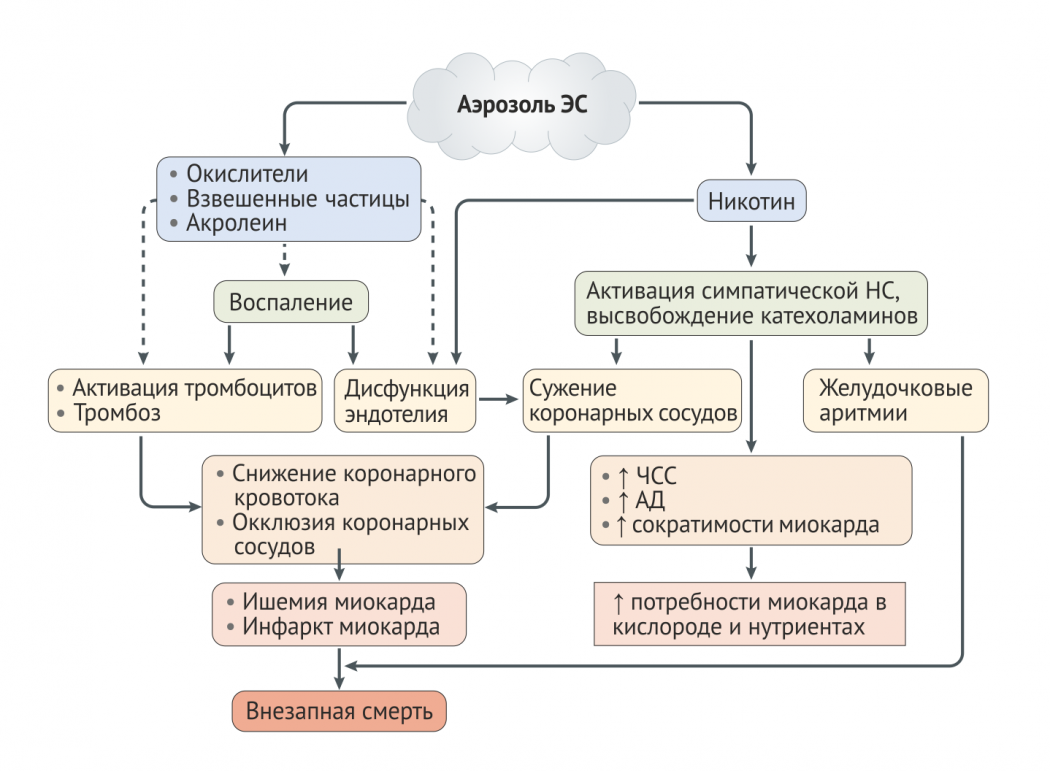 Эпидемиологические исследования рисков ССЗ, связанных с ЭС, трудно проектировать и интерпретировать, так как подавляющее большинство пользователей ЭС являются бывшими или текущими курильщиками сигарет [35]. Курильщиков, которые полностью перешли на ЭС, можно сравнивать с бросившими курение без использования ЭС при прогнозировании риска кардиоваскулярных событий, но людей, использующих только ЭС и находящихся в возрастной группе, для которой характерны наиболее острые сердечно-сосудистые события, довольно мало. Учитывая эти ограничения, любые выводы из текущих исследований ЭС должны быть интерпретированы с осторожностью. Сердечно-сосудистые эффекты, опосредуемые ЭС, по их механизмам потенциальной токсичности описаны ниже. На рис. 3 изображены гипотетические механизмы ЭС-индуцированных сердечно-сосудистых событий.
