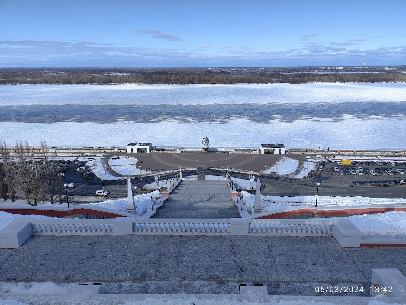 На окраине кремля можно спуститься по Чкаловской лестнице. Рядом есть лавочки, а ночью включается подсветка. Очень видовое место.