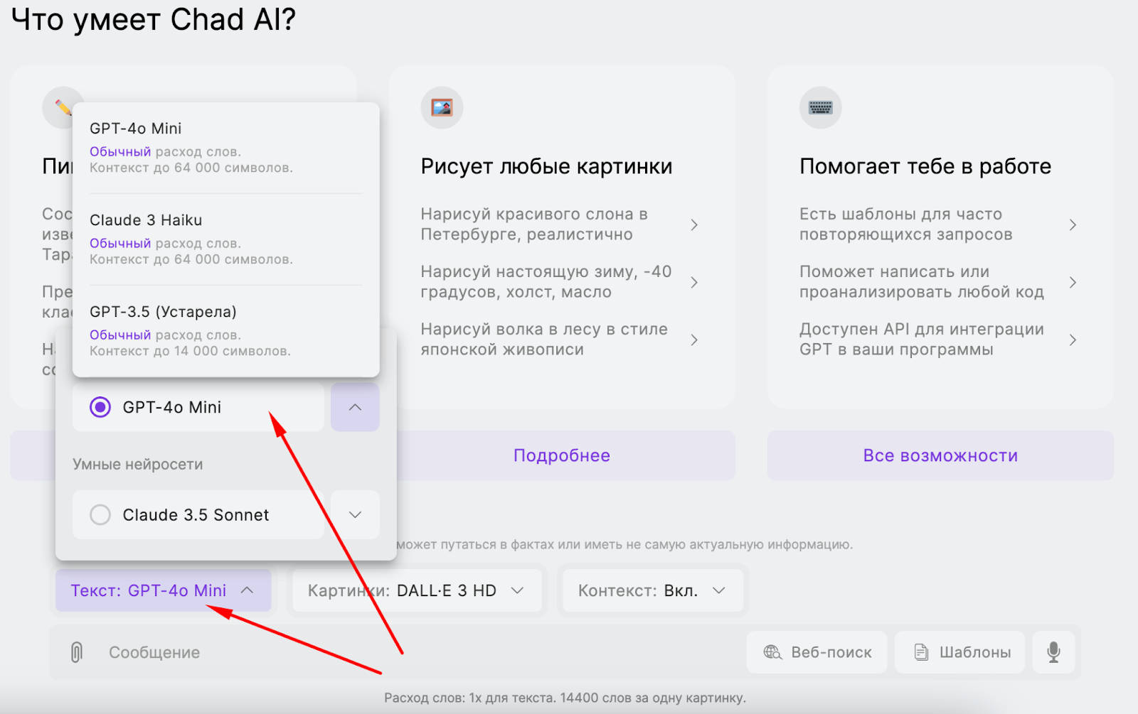 Подробнее о том, какую нейросеть выбрать, читайте в нашем посте в Телеграм. Но для старта советуем начать с GPT-4o Mini.