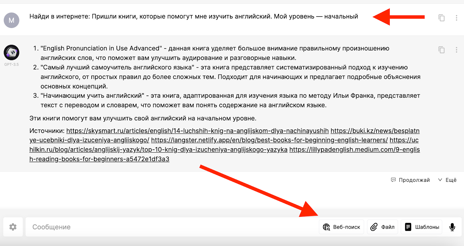 А если вы хотите дополнительно почитать литературу, просто нажмите на кнопку «Веб-поиск» и введите этот промпт (запрос):