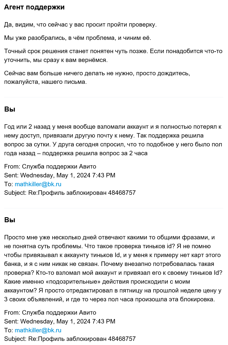 2 месяца переписки со службой поддержки Авито ни к чему не привели. Сначала мне постоянно отвечали расплывчато и не по теме, иногда казалось что отвечает нейросеть, почти 2 месяца, и порядка нескольких десятков писем. По итогу вообще пропали. И вот на днях объявились, сначала сказали что якобы все починили, попробовал зайти - ничего не изменилось, а когда об этом им сообщил - в итоге прямо написали что доступ не восстановят.