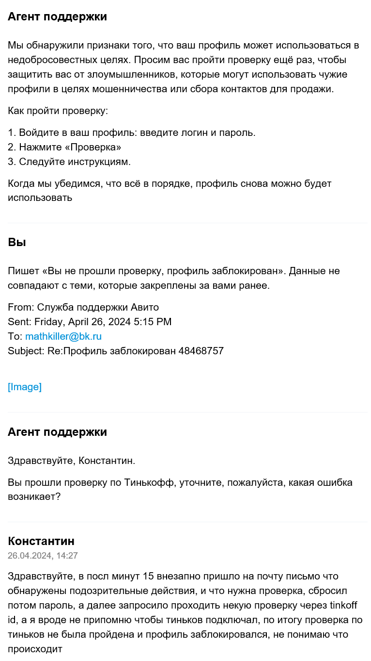 Далее запросило пройти некую проверку через tinkoff id. Я при этом никогда не был клиентом Tinkoff. Нажал кнопку "пройти проверку", и она не была пройдена. Далее Авито заблокировало мой профиль и теперь я всегда вижу такое сообщение при попытке войти: