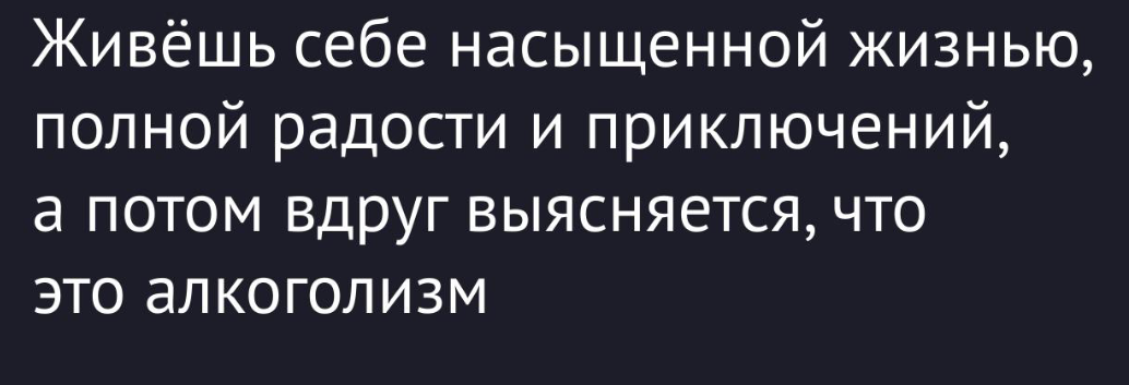 2222 schwarzzz Внезапно...1 8 месяцев назад Грустный юмор Алкоголизм Радость Приключения Повтор Алкоюмор Скриншот Жизнь 58 12 7 6 Ещё 0